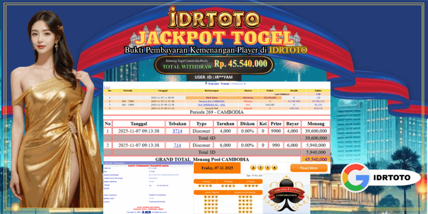 IDRTOTO JACKPOT PERMAINAN TOGEL CAMBODIA POOLS Rp.45.540.000 – LUNAS