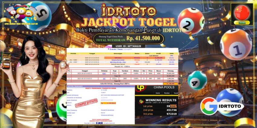 IDRTOTO BAYAR LUNAS JACKPOT PERMAINAN TOGEL CHINA POOLS Rp.41.500.000 – LUNAS