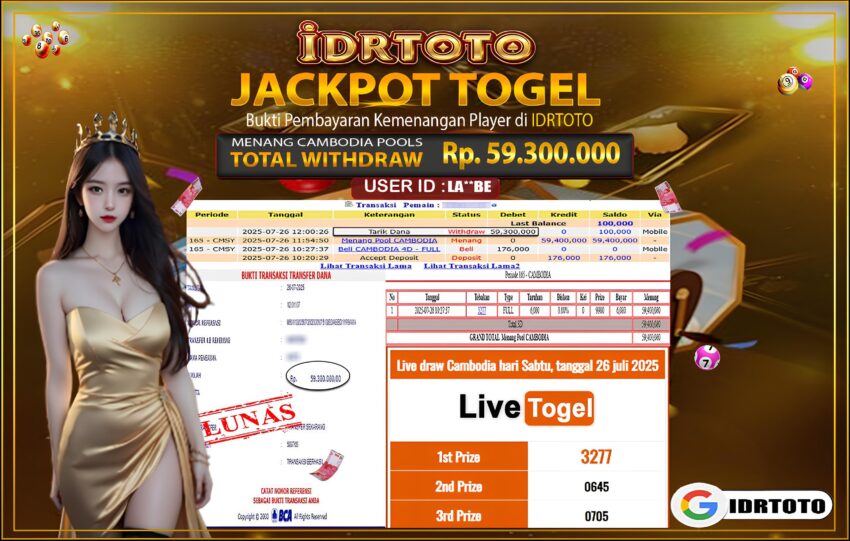 IDRTOTO BAYAR LUNAS JACKPOT TOGEL CAMBODIA POOLS Rp.59.300.,000 – LUNAS